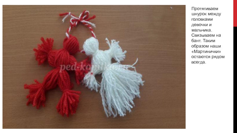Протягиваем шнурок между головками девочки и мальчика. Связываем на бант. Таким образом наши «Мартинички» остаются рядом всегда.