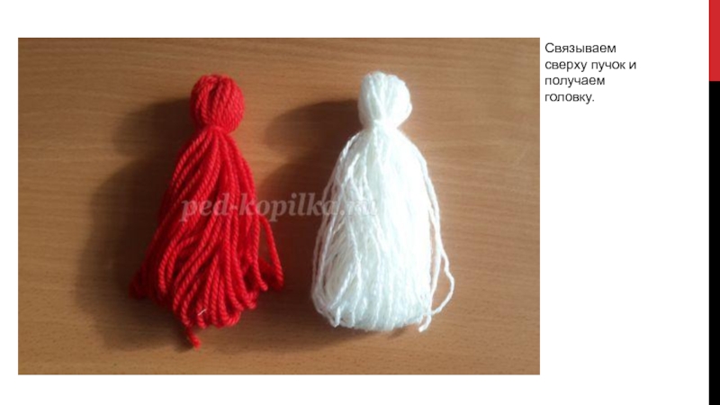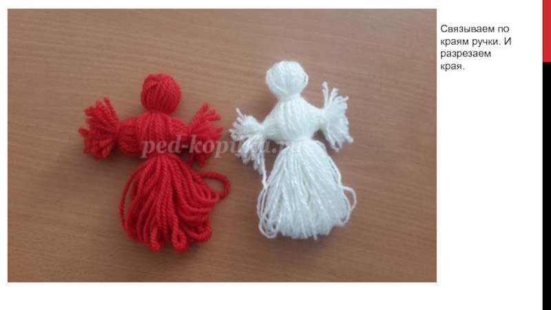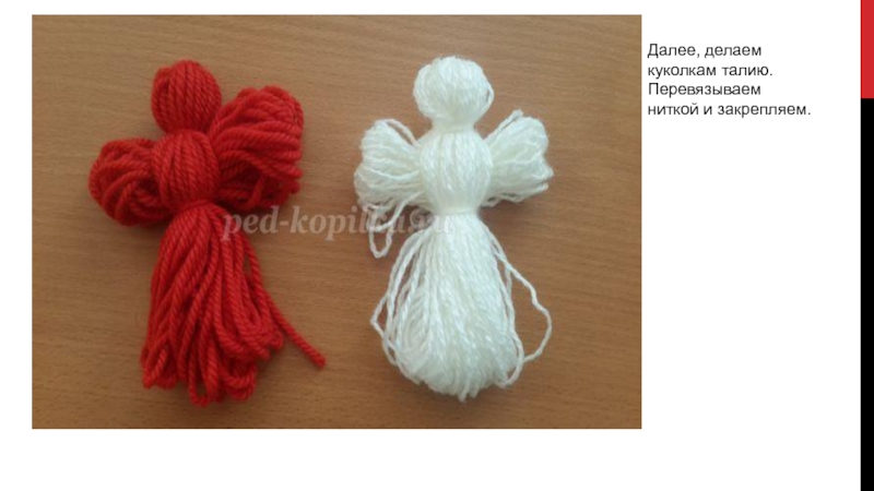 Слайд 11Далее, делаем куколкам талию. Перевязываем ниткой и закрепляем.
