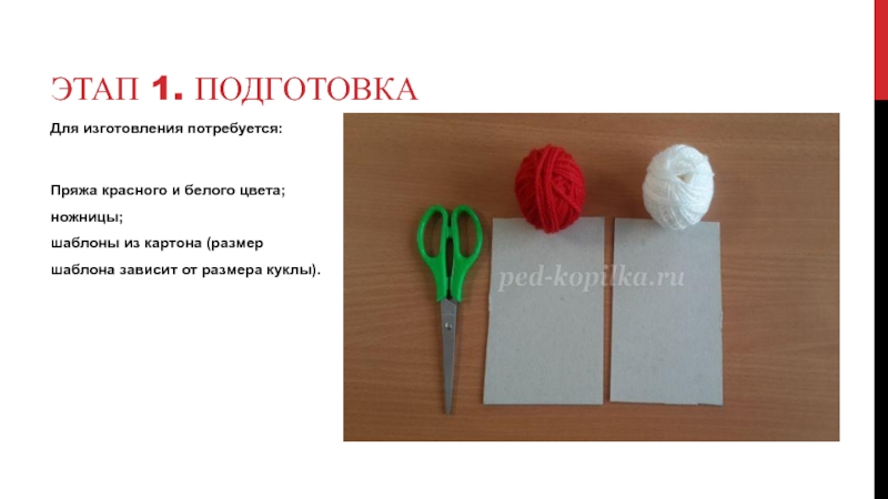 Для изготовления потребуется: Пряжа красного и белого цвета; ножницы; шаблоны из картона (размер шаблона зависит от размера куклы).Этап 1. Подготовка