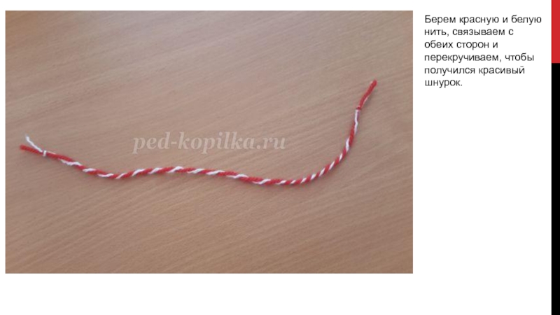 Слайд 14Берем красную и белую нить, связываем с обеих сторон и