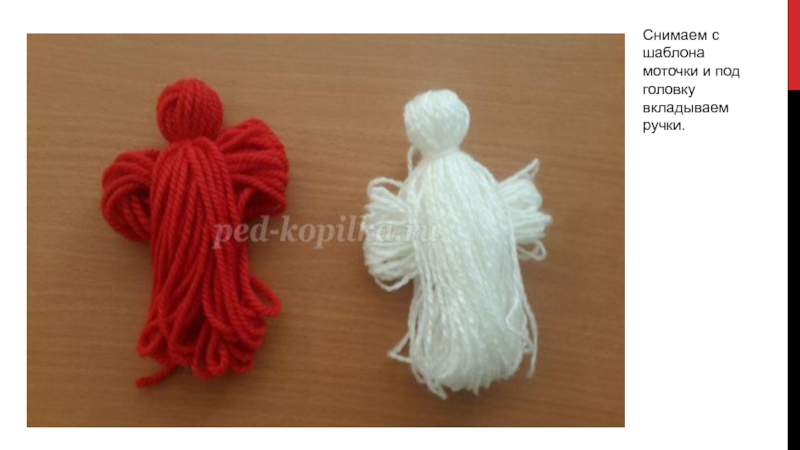 Слайд 10Снимаем с шаблона моточки и под головку вкладываем ручки.