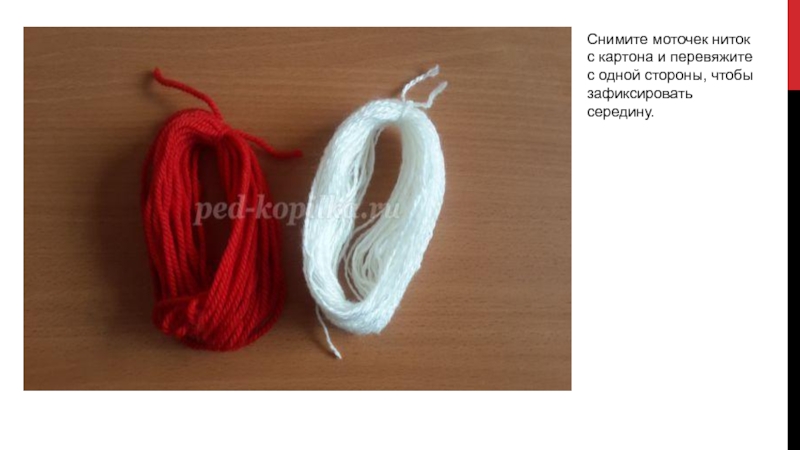 Слайд 7Снимите моточек ниток с картона и перевяжите с одной стороны,