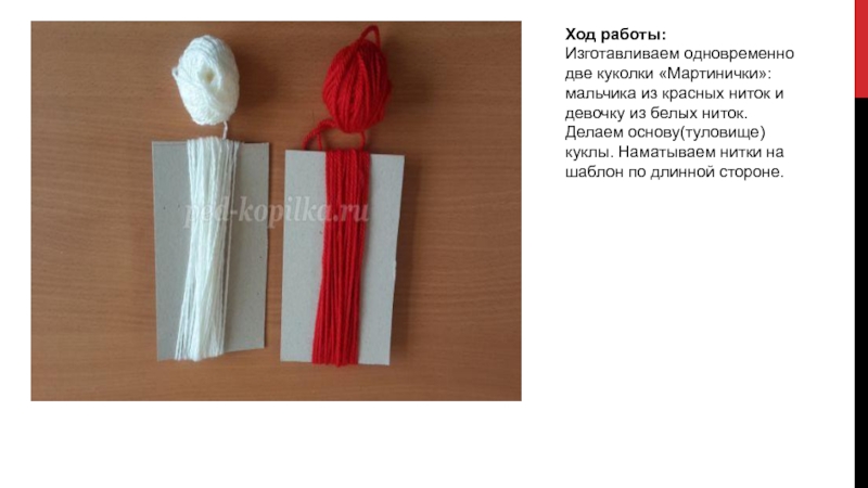Ход работы:Изготавливаем одновременно две куколки «Мартинички»: мальчика из красных ниток и девочку из белых ниток. Делаем основу(туловище)