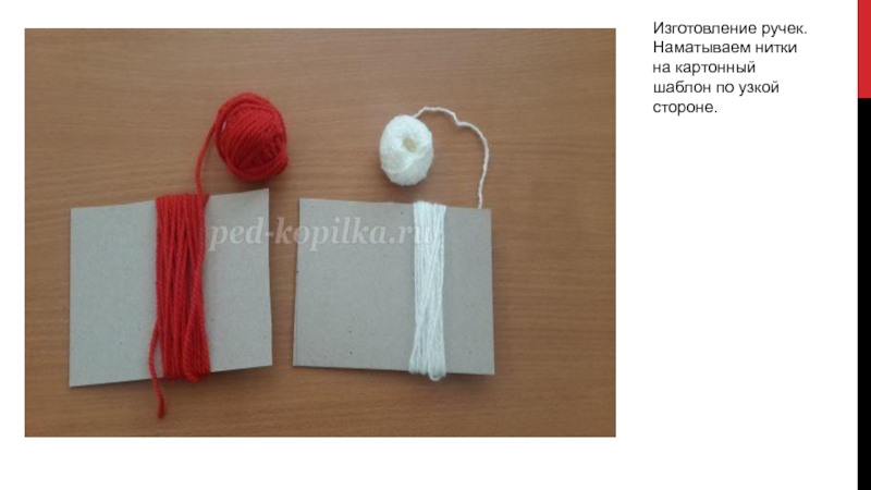 Слайд 9Изготовление ручек. Наматываем нитки на картонный шаблон по узкой стороне.