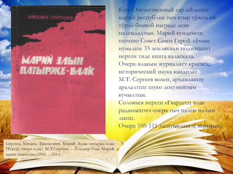 Сергеев, Михаил Тихонович. Марий Элын патырже-влак [Текст]: очерк-влак/ М.Т.Сергеев. – Йошкар-Ола: Марий книга савыктыш,1994. – 224 с.
