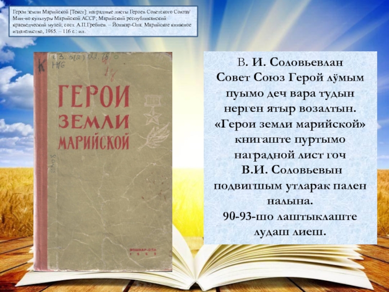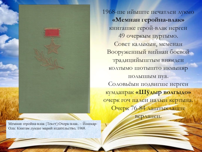 Мемнан геройна-влак [Текст]:Очерк-влак. – Йошкар-Ола: Книгам лукшо марий издательство, 1968.