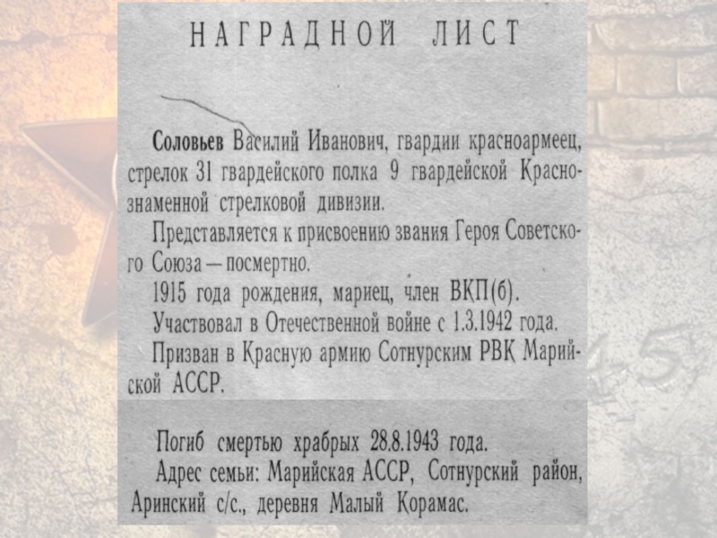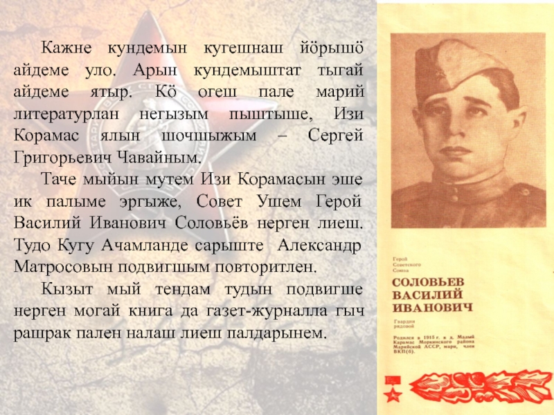 Совет Союз Герой лӱмым пуымо деч вара тудын нерген ятыр возалтын. «Герои земли марийской» книгаште пуртымо наградной лист гоч