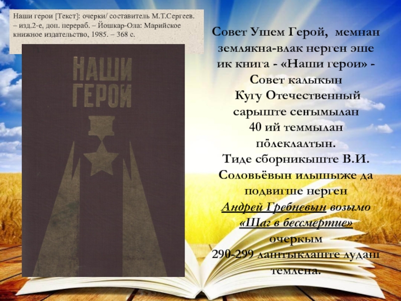 Наши герои [Текст]: очерки/ составитель М.Т.Сергеев. – изд.2-е, доп. перераб. – Йошкар-Ола: Марийское книжное издательство, 1985. – 368 с.