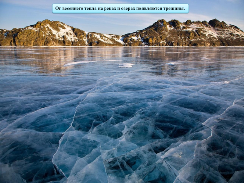 Слайд 8От весеннего тепла на реках и озерах появляются трещины.