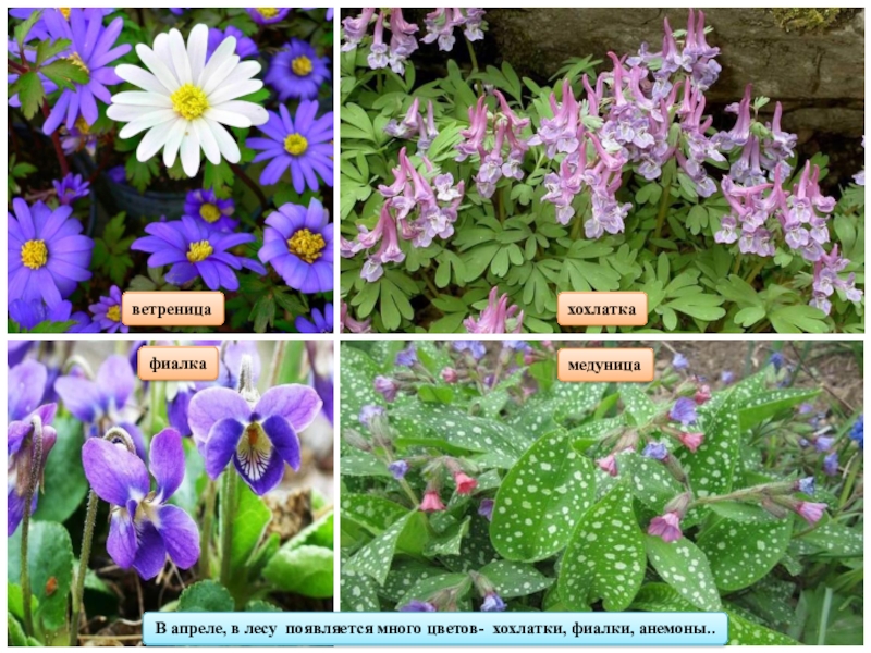 ветреницафиалкахохлаткаВ апреле, в лесу появляется много цветов- хохлатки, фиалки, анемоны..медуница
