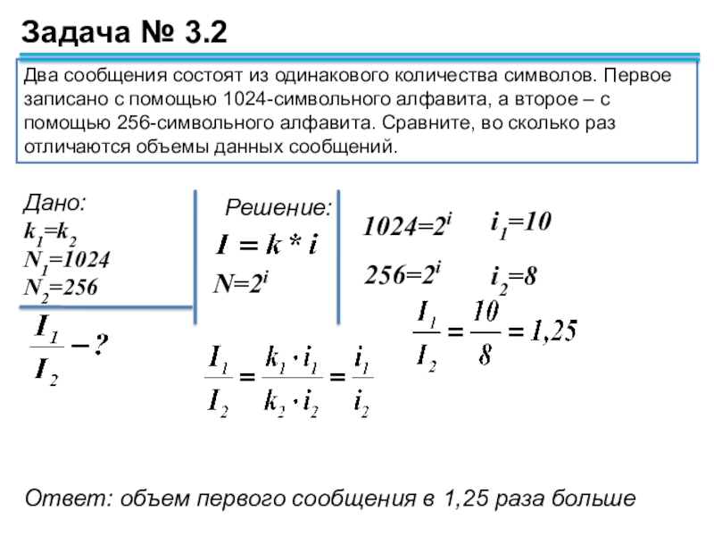 Ответ: объем первого сообщения в 1,25 раза больше