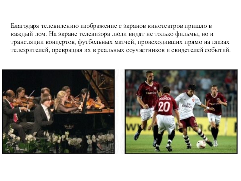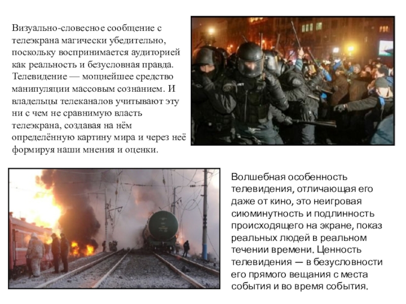 Волшебная особенность телевидения, отличающая его даже от кино, это неигровая сиюминутность и подлинность происходящего на экране, показ реальных людей в реальном течении времени. Ценность телевидения — в безусловности его прямого вещания с места события и во время события.