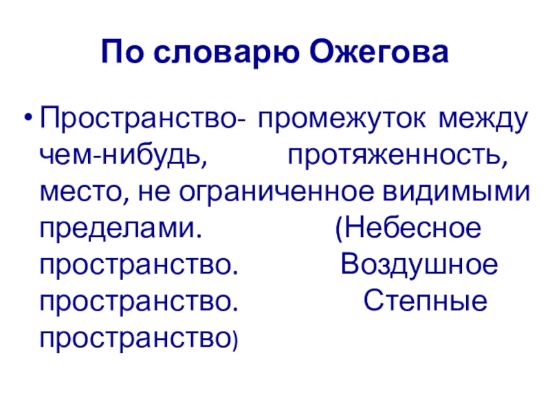 По словарю ОжеговаПространство- промежуток между чем-нибудь, протяженность, место, не ограниченное видимыми пределами. (Небесное пространство. Воздушное пространство. Степные