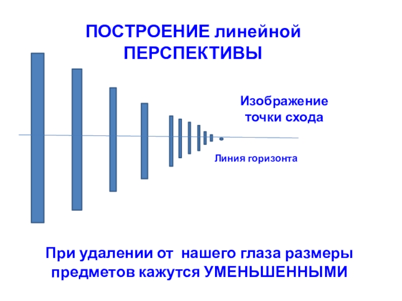Линия горизонтаИзображение точки сходаПОСТРОЕНИЕ линейной ПЕРСПЕКТИВЫПри удалении от нашего глаза размеры предметов кажутся УМЕНЬШЕННЫМИ