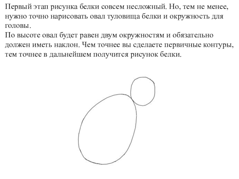Первый этап рисунка белки совсем несложный. Но, тем не менее, нужно точно нарисовать овал туловища белки и окружность для головы.  По высоте овал будет равен двум окружностям и обязательно должен иметь