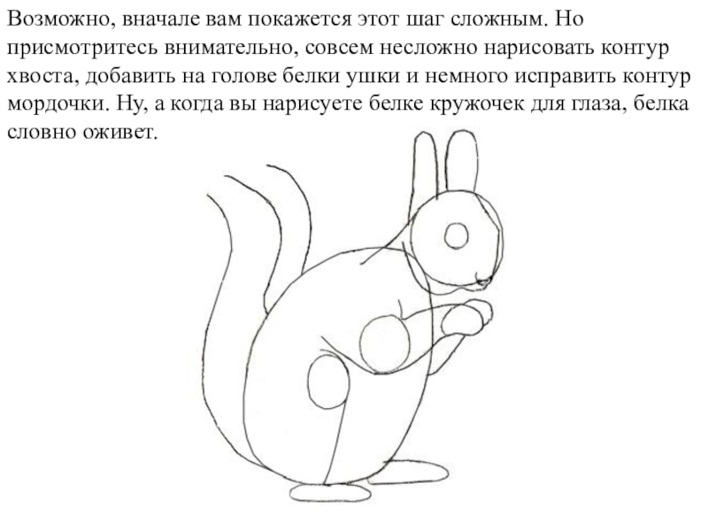 Слайд 5Первый этап рисунка белки совсем несложный. Но, тем не менее,