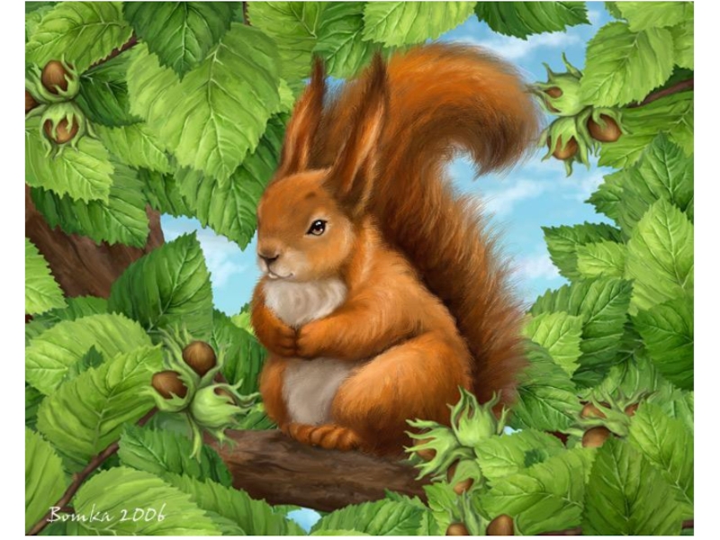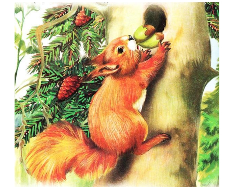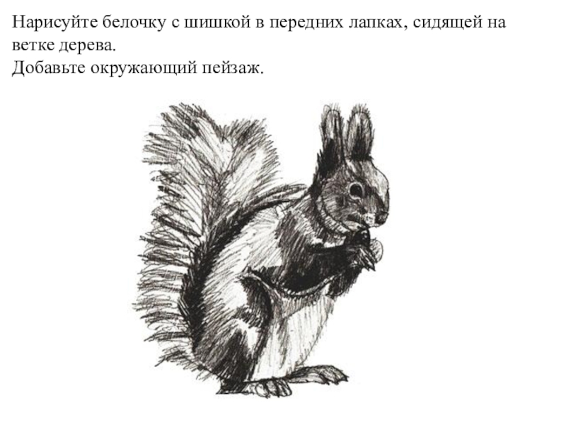 Слайд 10Нарисуйте белочку с шишкой в передних лапках, сидящей на ветке