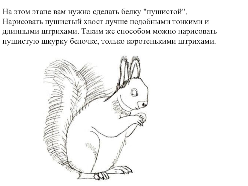 Слайд 9На этом этапе вам нужно сделать белку "пушистой".  Нарисовать пушистый хвост