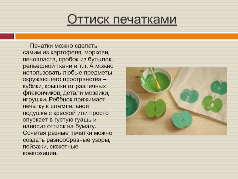 предметы окружающего пространства – кубики, крышки от различных флакончиков, детали мозаики, игрушки. Ребёнок прижимает печатку к штемпельной подушке с краской или просто опускает в густую гуашь и наносит оттиск на бумагу. Сочетая разные печатки можно создать разнообразные узоры, пейзажи, сюжетные композиции.