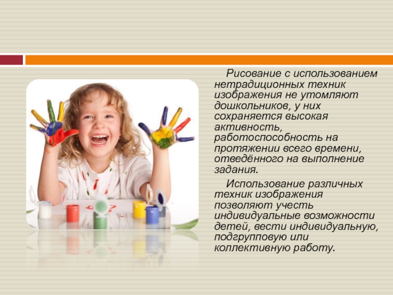 Слайд 5 Рисование с использованием нетрадиционных техник изображения не утомляют дошкольников, у