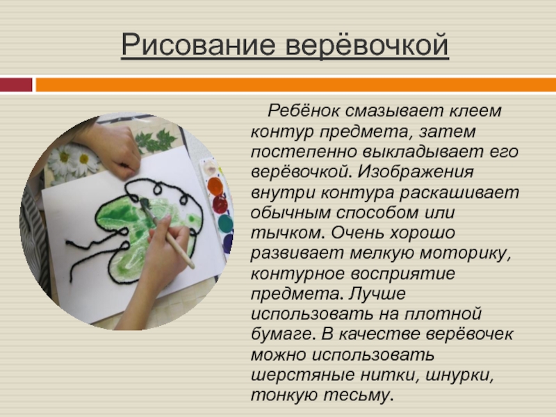 верёвочкой. Изображения внутри контура раскашивает обычным способом или тычком. Очень