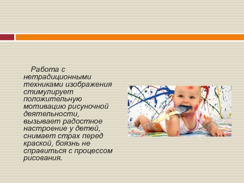 Слайд 4 Работа с нетрадиционными техниками изображения стимулирует положительную мотивацию рисуночной деятельности,