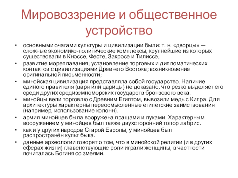 Мировоззрение и общественное устройствоосновными очагами культуры и цивилизации были: т. н. «дворцы» — сложные экономико-политические комплексы, крупнейшие из которых