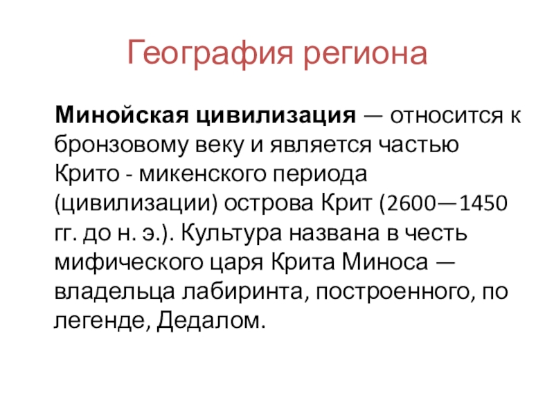 География регионаМинойская цивилизация — относится к бронзовому веку и является частью Крито - микенского периода (цивилизации) острова Крит