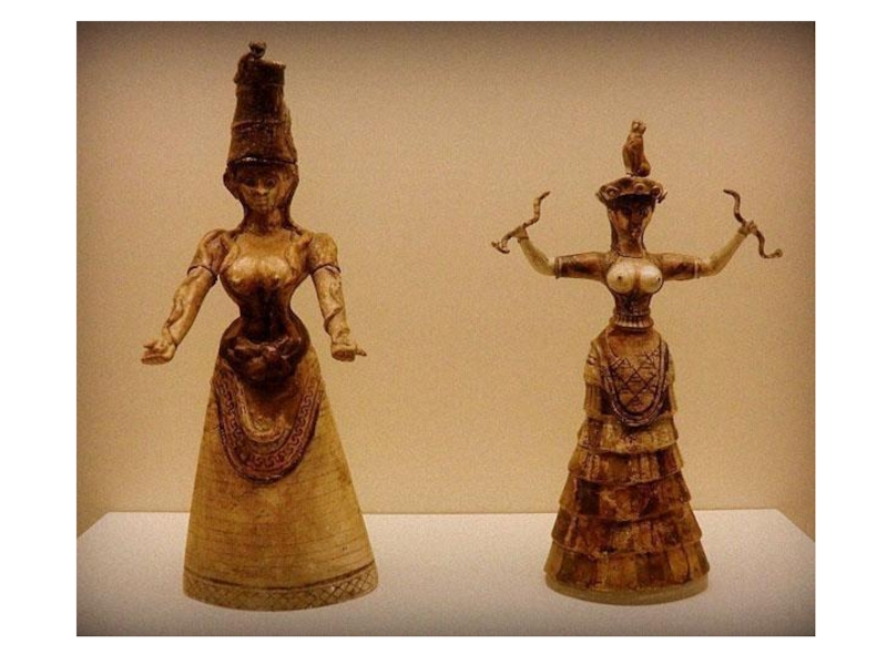 данные археологии говорят о том, что в минойской религии (и в других сферах жизни) главенствующие роли играли женщины, в частности почиталась Богиня со змеями.