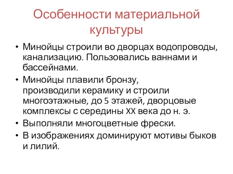 Особенности материальной культурыМинойцы строили во дворцах водопроводы, канализацию. Пользовались ваннами и бассейнами.Минойцы плавили бронзу, производили керамику и строили многоэтажные, до