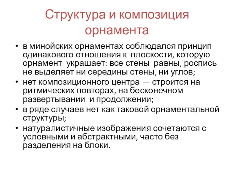 Структура и композиция орнаментав минойских орнаментах соблюдался принцип одинакового отношения к‭  ‬плоскости,‭ ‬которую орнамент‭  ‬украшает:‭ ‬все стены‭
