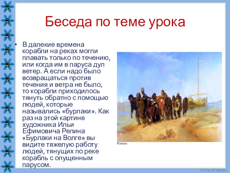 ветер. А если надо было возвращаться против течения и ветра не было, то корабли приходилось тянуть обратно с помощью людей, которые назывались «бурлаки». Как раз на этой картине художника Ильи Ефимовича Репина «Бурлаки на Волге» вы видите тяжелую работу людей, тянущих по реке корабль с опущенным парусом.