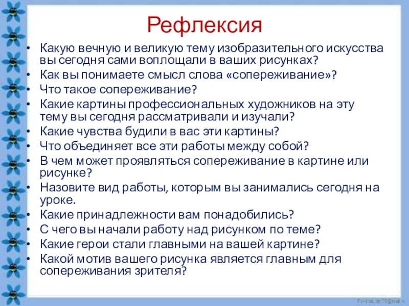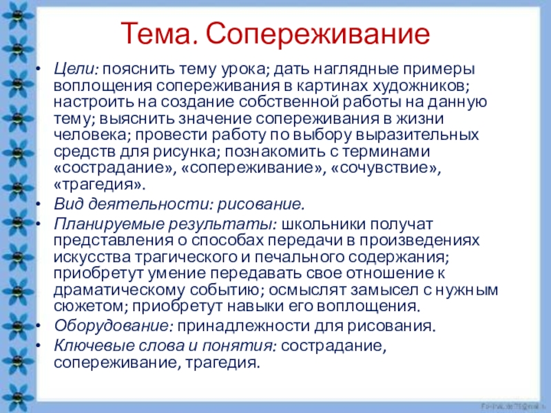 Цели: пояснить тему урока; дать наглядные примеры воплощения сопереживания