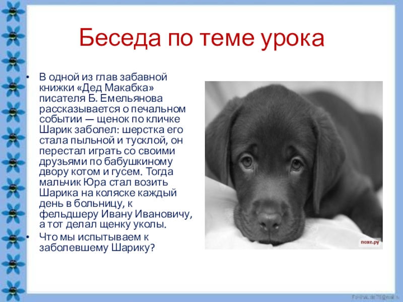 Макабка» писателя Б. Емельянова рассказывается о печальном событии — щенок
