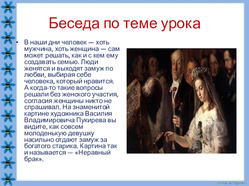 ему создавать семью. Люди женятся и выходят замуж по любви, выбирая себе человека, который нравится. А когда-то такие вопросы решали без женского участия, согласия женщины никто не спрашивал. На знаменитой картине художника Василия Владимировича Пукирева вы видите, как совсем молоденькую девушку насильно отдают замуж за богатого старика. Картина так и называется — «Неравный брак».