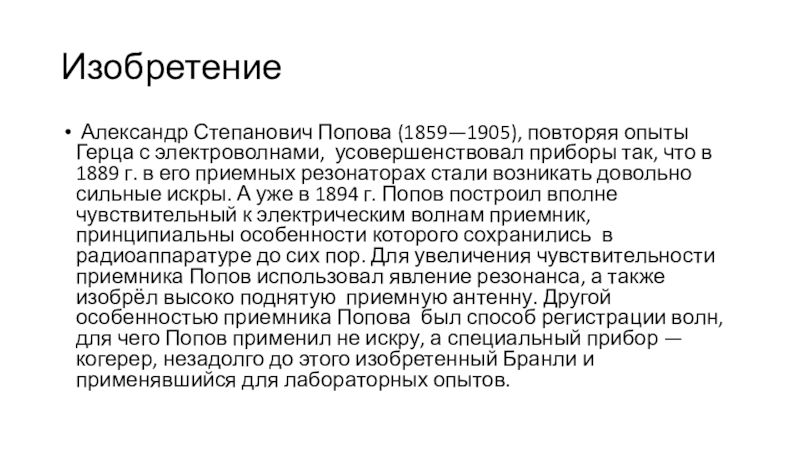 Изобретение Александр Степанович Попова (1859—1905), повторяя опыты Герца с электроволнами,  усовершенствовал приборы так, что в 1889 г. в его приемных резонаторах стали возникать довольно сильные искры. А уже в 1894 г. Попов
