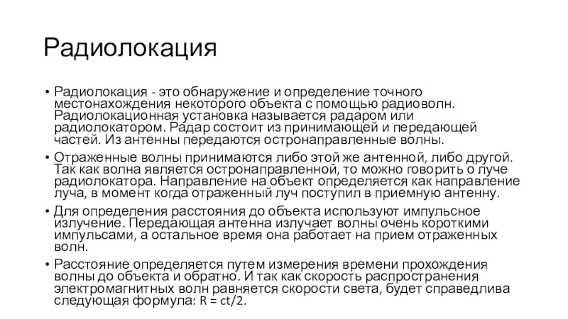 Радиолокация - это обнаружение и определение точного местонахождения некоторого объекта
