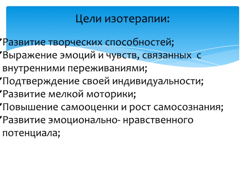 Цели изотерапии: Развитие творческих способностей;Выражение эмоций и чувств, связанных с внутренними переживаниями;Подтверждение своей индивидуальности;Развитие мелкой моторики;Повышение самооценки