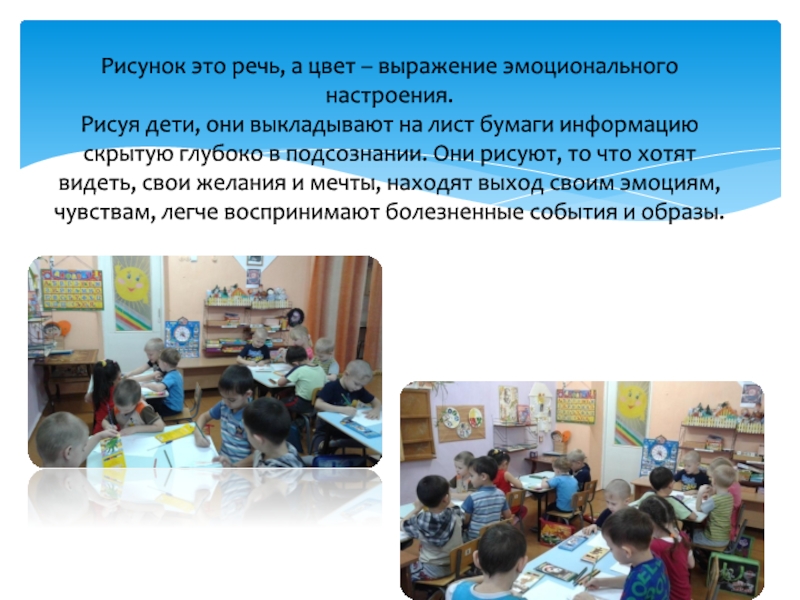 Слайд 7 Рисунок это речь, а цвет – выражение эмоционального настроения. Рисуя дети,
