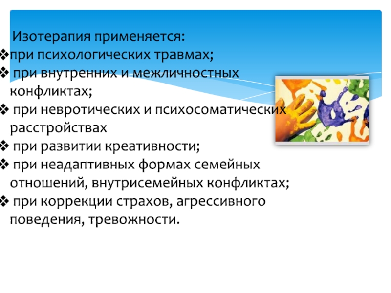 Изотерапия применяется:при психологических травмах; при внутренних и межличностных конфликтах; при невротических и психосоматических расстройствах при развитии