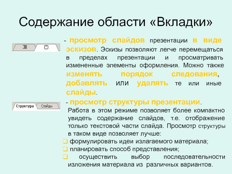 Работа в этом режиме позволяет более компактно увидеть содержание слайдов, т.е. отображение только текстовой части слайда. Просмотр структуры в таком виде позволяет лучше:
