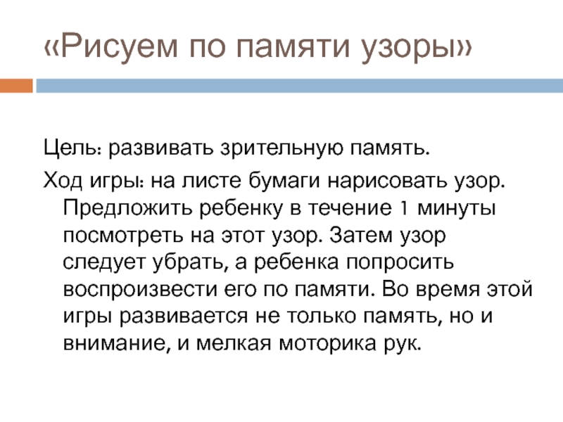 «Рисуем по памяти узоры»Цель: развивать зрительную память. Ход игры: на листе бумаги нарисовать узор. Предложить ребенку в
