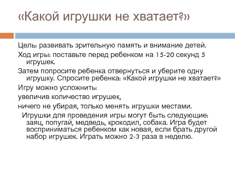 «Какой игрушки не хватает?» Цель: развивать зрительную память и внимание детей.Ход игры: поставьте перед ребенком на 15-20