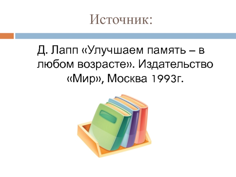 Источник: Д. Лапп «Улучшаем память – в любом возрасте». Издательство «Мир», Москва 1993г.
