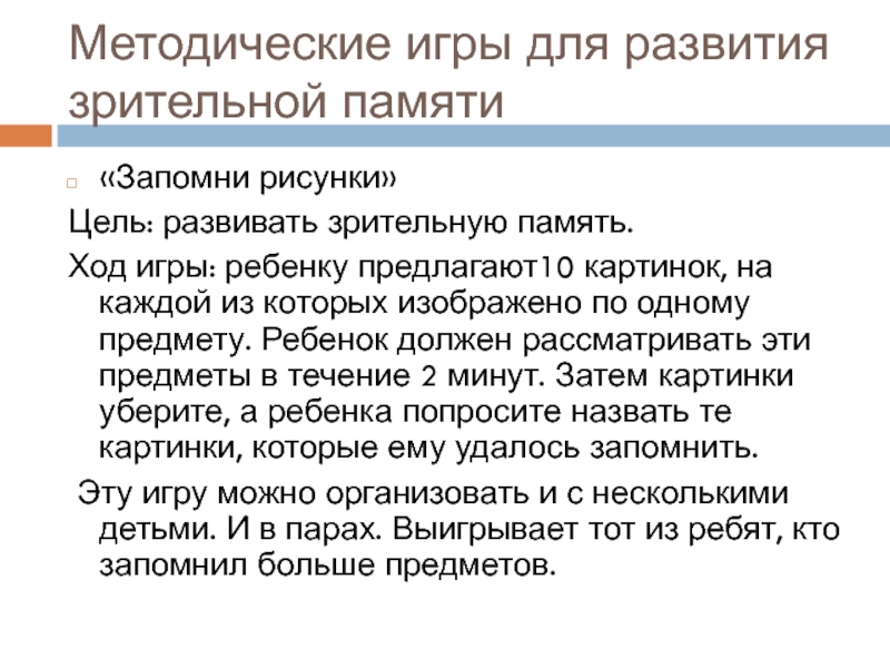 Слайд 7Методические игры для развития зрительной памяти