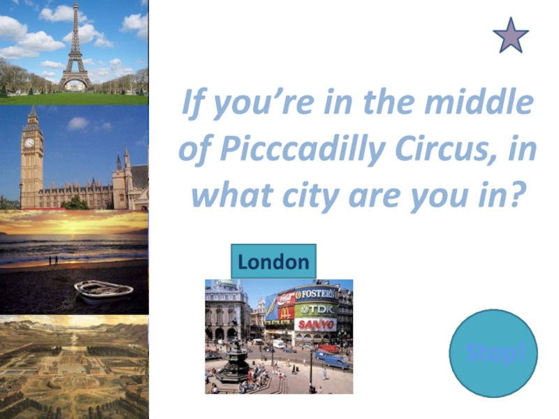 If you’re in the middleof Picccadilly Circus, inwhat city are you in? LondonStop!