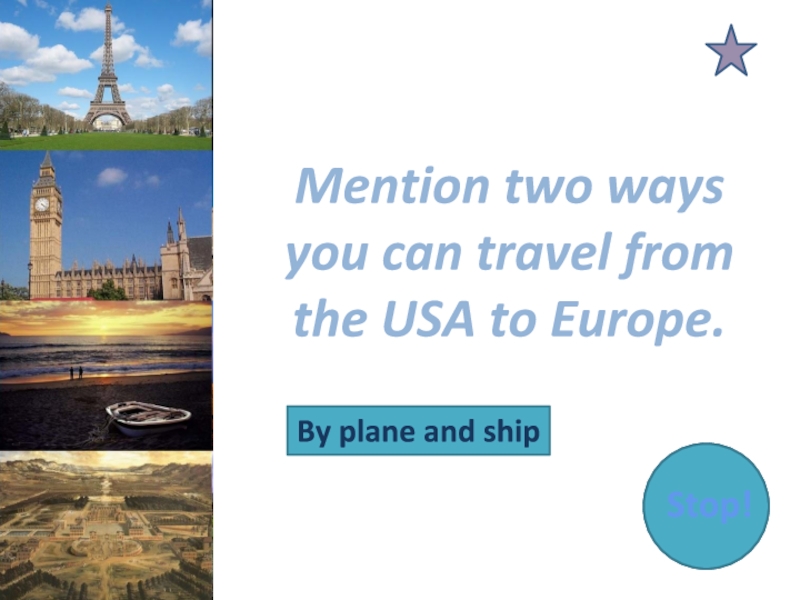 Mention two waysyou can travel fromthe USA to Europe.By plane and shipStop!