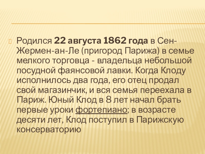 Слайд 3Родился 22 августа 1862 года в Сен-Жермен-ан-Ле (пригород Парижа) в семье мелкого торговца - владельца небольшой