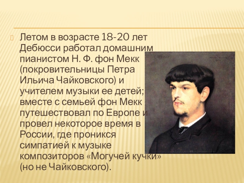 Летом в возрасте 18-20 лет Дебюсси работал домашним пианистом Н. Ф. фон Мекк (покровительницы Петра Ильича Чайковского) и