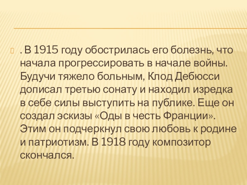 сонату и находил изредка в себе силы выступить на публике. Еще он создал эскизы «Оды в честь Франции». Этим он подчеркнул свою любовь к родине и патриотизм. В 1918 году композитор скончался.